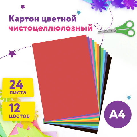 Картон цветной А4 МЕЛОВАННЫЙ, 24 листа, 12 цветов, в папке, ЮНЛАНДИЯ, 200х290 мм, 113551