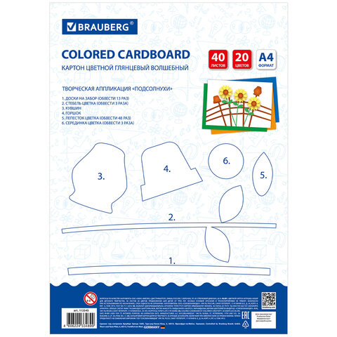 Набор цветного картона BRAUBERG предназначен для творчества и хобби и может использоваться детьми с трехлетнего возраста. Картон рекомендован для уроков труда и технологии. Творческая инструкция по созданию аппликации на обороте.