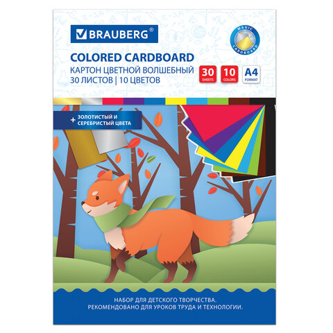 Картон цветной А4 немелованный ВОЛШЕБНЫЙ, 30 л., 10 цветов, в папке, BRAUBERG, 200х290 мм, Лисенок, 115641