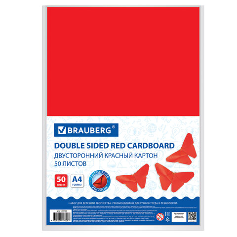 Картон цветной А4 ТОНИРОВАННЫЙ В МАССЕ, 50 листов, КРАСНЫЙ, 220 г/м2, BRAUBERG, 210х297 мм, 128982