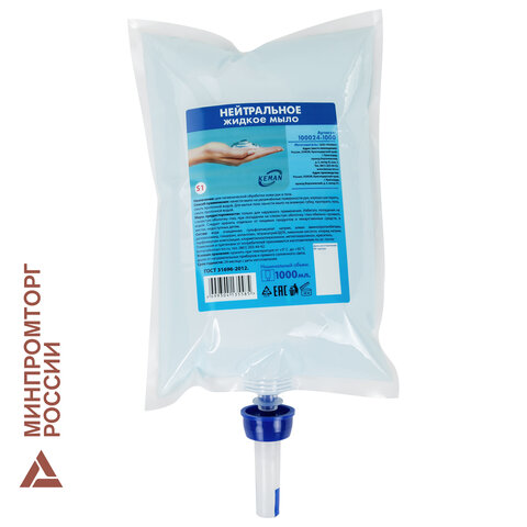 Картридж с жидким мылом одноразовый (Система S1) "Нейтральное", синее, 1 л, KEMAN, 100024-1000