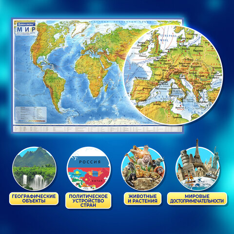 На географической карте мира BRAUBERG отображаются названия континентов, океанов и морей, рек, гор, течений.