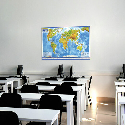 Карта мира физическая 120х78 см, 1:25М, с ламинацией, интерактивная, европодвес, BRAUBERG, 112379