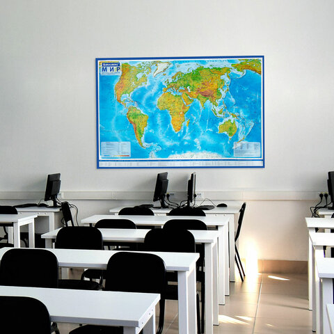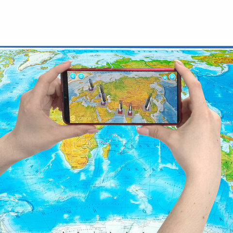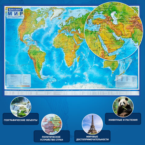 Карта мира физическая 157х107 см, 1:21,5М, с ламинацией, интерактивная, в тубусе, BRAUBERG, 112388