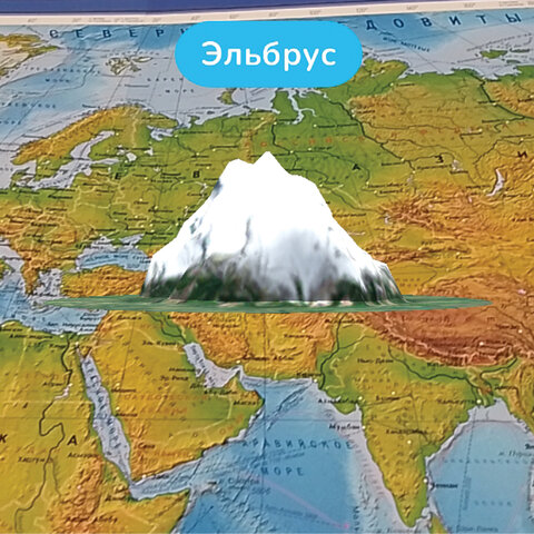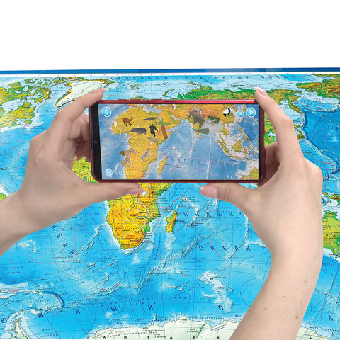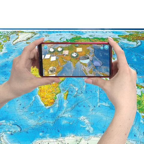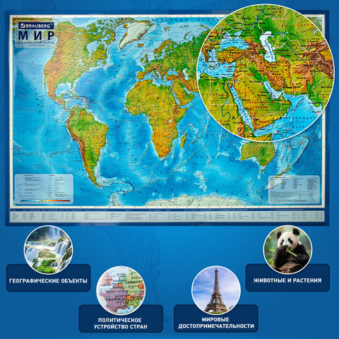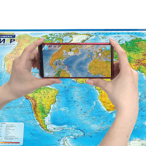 Карта мира физическая 199х134 см, 1:15,5М, с ламинацией, интерактивная, в тубусе, BRAUBERG, 112389