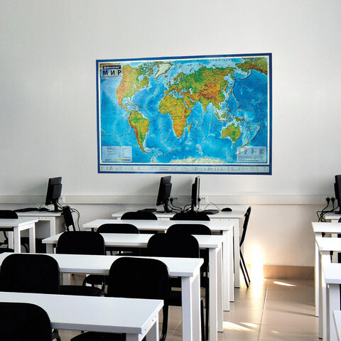На географической карте мира BRAUBERG отображаются названия континентов, океанов и морей, рек, гор, течений.