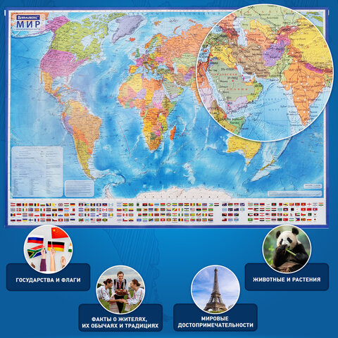 На политической карте мира BRAUBERG отображается современное политико-административное устройство мира: названия государств и их столицы, крупнейшие города и границы стран. Ниже расположены государственные флаги.