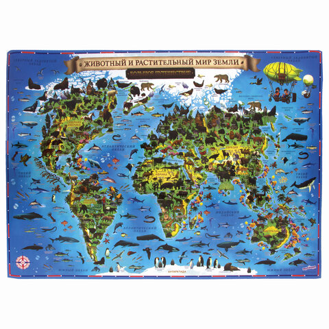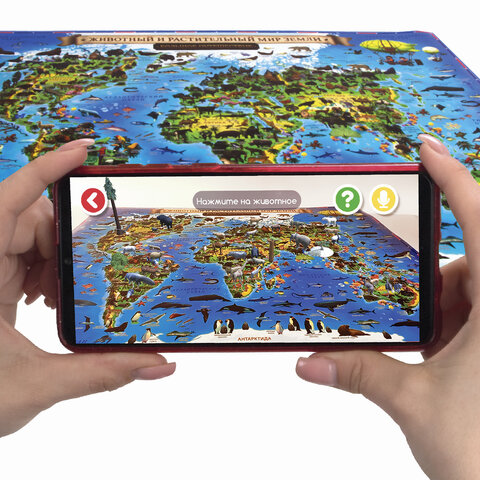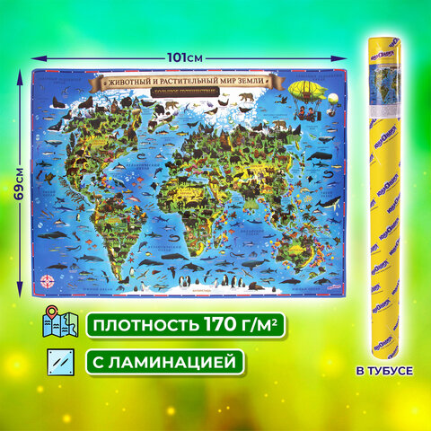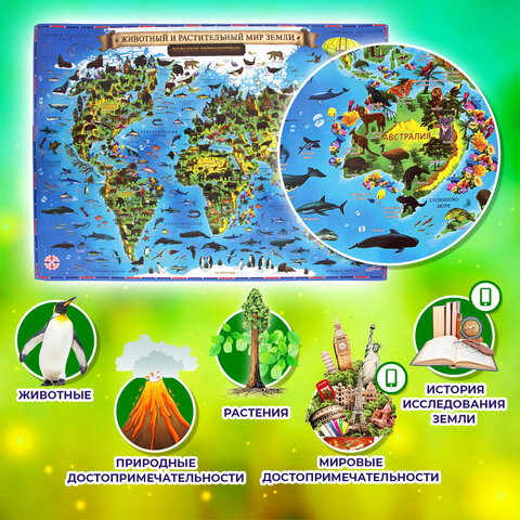 Карта мира "Животный и растительный мир" 101х69 см, интерактивная, в тубусе, ЮНЛАНДИЯ, 112373