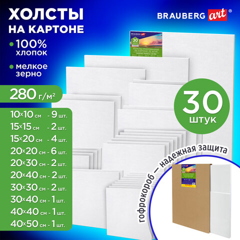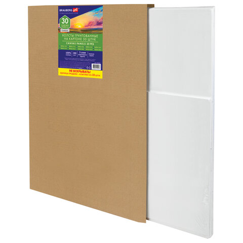 Холсты на картоне НАБОР 30 штук в коробе, хлопок, грунт, 280 г/м2, BRAUBERG ART CLASSIC, 192663