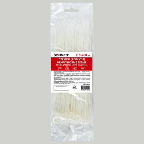 Стяжки (хомуты) нейлоновые SONNEN используются при проведении электромонтажных работ для крепления кабелей, проводов и других предметов к несущей поверхности или для соединения между собой. Такие стяжки также используются для бытовых и хозяйственных нужд.