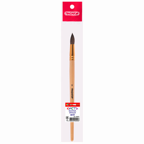 Кисть ПИФАГОР, БЕЛКА, круглая, № 9, деревянная лакированная ручка, с колпачком, пакет с подвесом, 200823