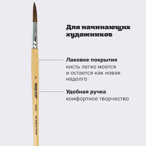 Кисть ПИФАГОР, ПОНИ, круглая, № 7, деревянная лакированная ручка, колпачок, пакет с подвесом, 200836