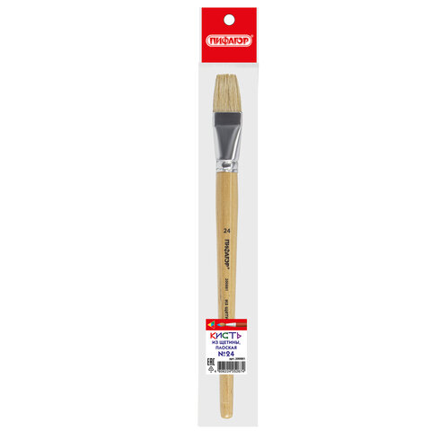 Кисть ПИФАГОР, ЩЕТИНА, плоская, № 24, деревянная лакированная ручка, пакет с подвесом, 200881