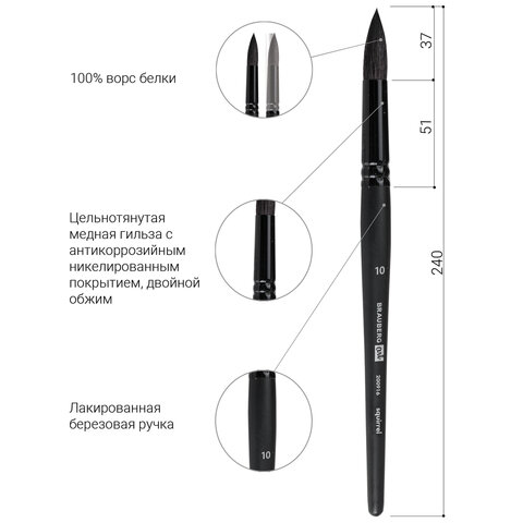 Кисть художественная проф. BRAUBERG ART CLASSIC, белка, круглая, № 10, 200916