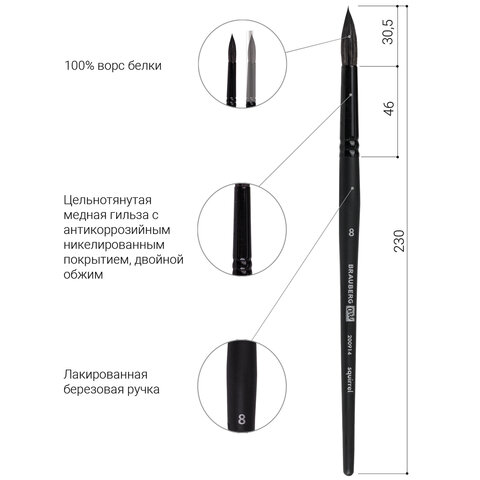 Кисть художественная проф. BRAUBERG ART CLASSIC, белка, круглая, № 8, 200914