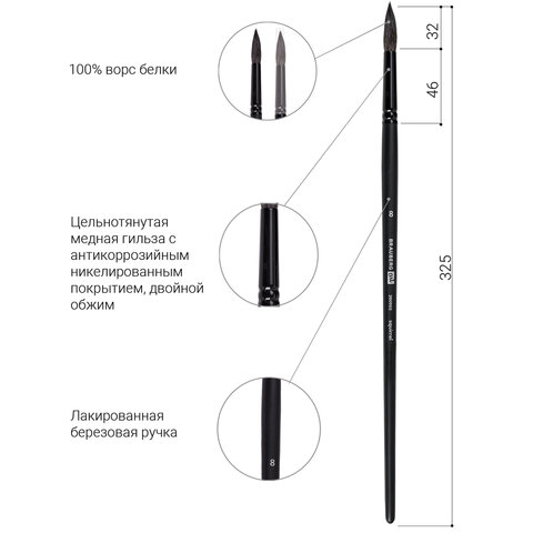 Кисть художественная проф. BRAUBERG ART CLASSIC, белка, круглая, № 8, длинная ручка, 200905