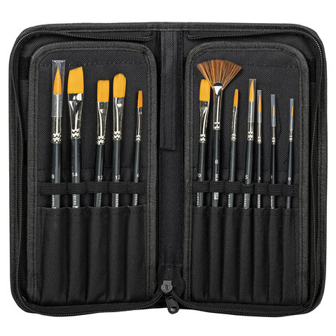 Кисти художественные набор 12 шт. в черном пенале, синтетика, BRAUBERG ART CLASSIC, № 0-14 + веерная, 200966