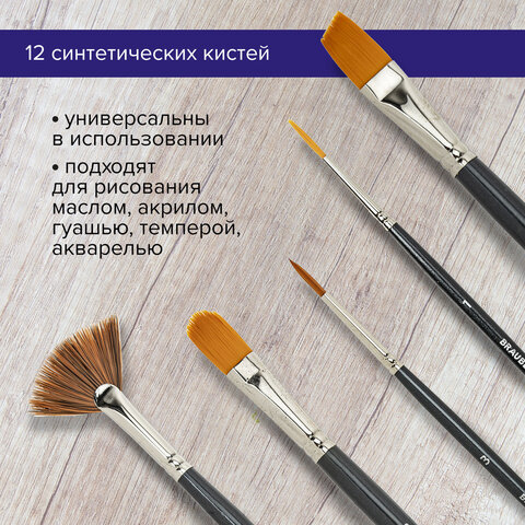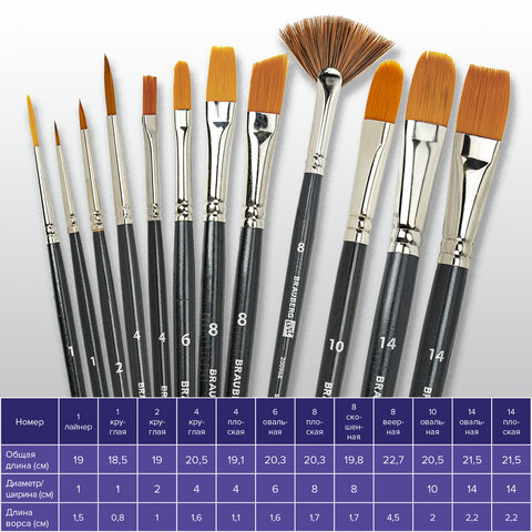 Кисти художественные набор 12 шт., в черной скрутке, синтетика, BRAUBERG ART CLASSIC, № 1-14 + веерная, 200968
