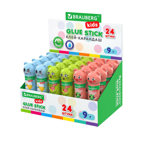 Клей-карандаш BRAUBERG KIDS "Зверята: кошка, мышка, хрюшка" с колпачком в виде животных идеально подходит для занятий творчеством в игровой форме в детском саду, школе и дома.