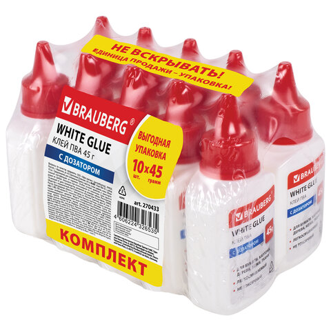 Клей ПВА КОМПЛЕКТ 10 штук х 45 г (бумага, картон, дерево), ВЫГОДНАЯ УПАКОВКА, BRAUBERG, 270433, 93