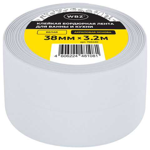 Клейкая лента бордюрная для ванны и кухни 38 мм х 3,2 м, белая, акриловая основа, WBZ (ВБЗ), 700430