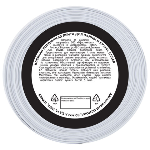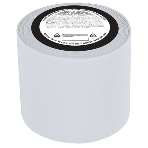 Клейкая лента бордюрная для ванны и кухни 60 мм х 3,2 м, белая, акриловая основа, WBZ (ВБЗ), 700429