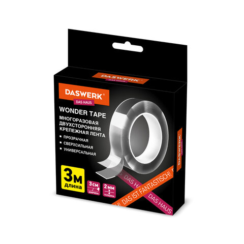 Многоразовая двухсторонняя прозрачная крепежная лента "Скотч NANO tape" 3 м х 30 мм, 2 мм, DASWERK (ДАСВЕРК), 607928