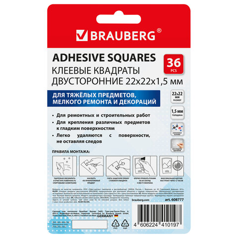 Клеевые квадраты двусторонние BRAUBERG применяется для фиксации предметов и крепежа к различным типам поверхностей, в том числе прозрачным.