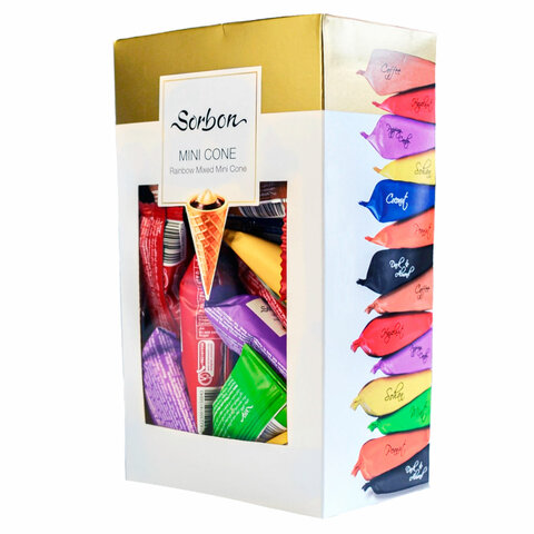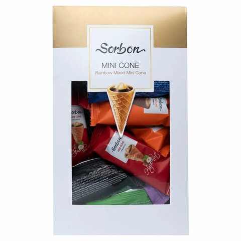 Мини-рожки SORBON "Ассорти Радуга" – это хрустящие вафельные рожки и нежные начинки: кофе, мята, кокос, арахис, сохан, фундук, стреляющая карамель, миндаль. Представлены в эстетичной подарочной упаковке.