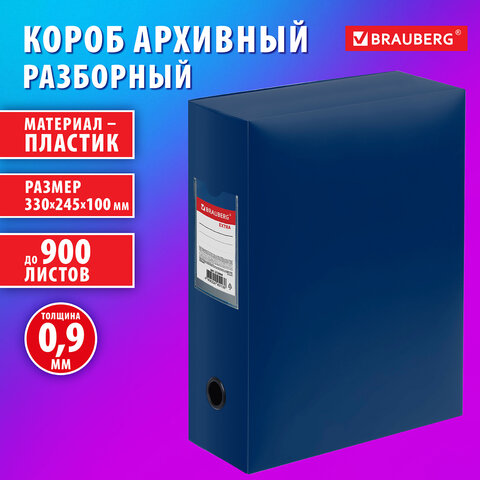 Короб архивный 330х245х100 мм, пластик разборный, до 900 листов, синий, 0,9 мм, BRAUBERG EXTRA, 272894