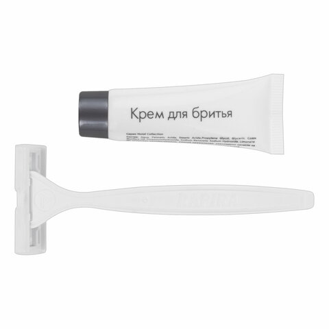 В наборе: одноразовый бритвенный станок с двойным лезвием из высококачественной стали со смазывающей пластиной с алоэ вера, крем для бритья в тубе 8 г.