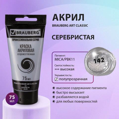 Краска акриловая художественная BRAUBERG ART CLASSIC, туба 75 мл, СЕРЕБРИСТАЯ, 191117