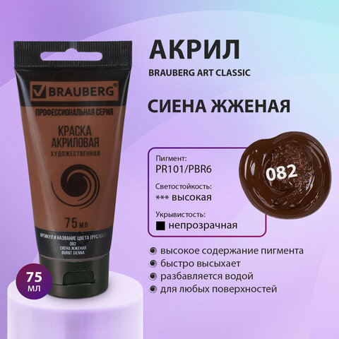 Краска акриловая художественная BRAUBERG ART CLASSIC, туба 75 мл, СИЕНА ЖЖЕНАЯ, 191111