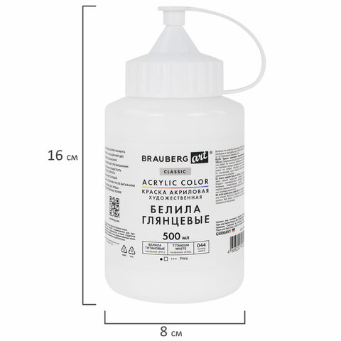 Краска акриловая художественная ГЛЯНЦЕВАЯ, 500 мл в банке, белила титановые, BRAUBERG ART, 192539