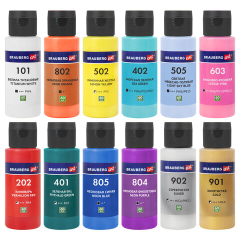 Краски акриловые для техники "Флюид Арт" (POURING PAINT), НАБОР 12 цветов по 60 мл, BRAUBERG ART CLASSIC, 192236