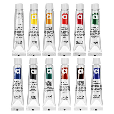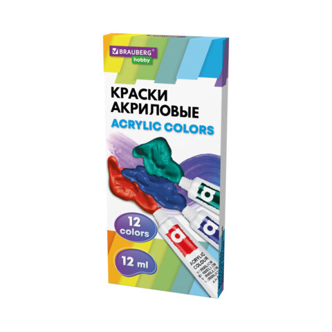 Краски акриловые художественные 12 цветов в тубах по 12 мл, BRAUBERG HOBBY, 192403