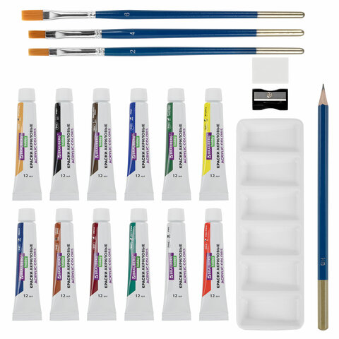 Краски акриловые художественные 12 цветов в тубах по 12 мл, кисти 3 шт., палитра, аксессуары, 19 предметов, BRAUBERG HOBBY, 192543