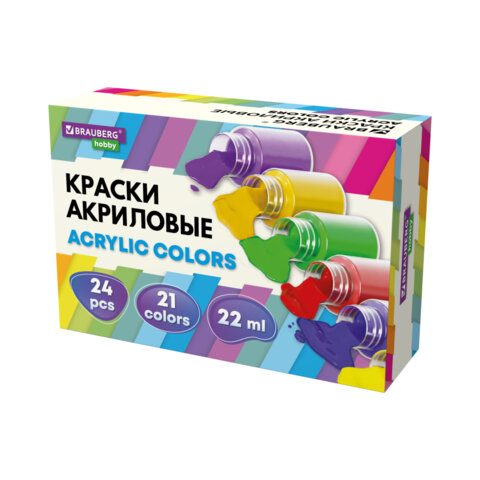 Краски акриловые художественные 24 шт., 21 цвет в банках по 22 мл, BRAUBERG HOBBY, 192412