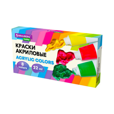 Краски акриловые художественные 8 цветов в тубах по 22 мл, BRAUBERG HOBBY, 192405