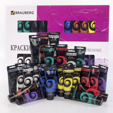 Краски акриловые художественные BRAUBERG ART DEBUT, НАБОР 24 шт. по 75 мл, 8 цветов, в тубах, 191128
