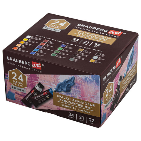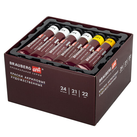 Краски акриловые художественные BRAUBERG ART PREMIERE, НАБОР 24 шт., в тубах по 22 мл, 191782