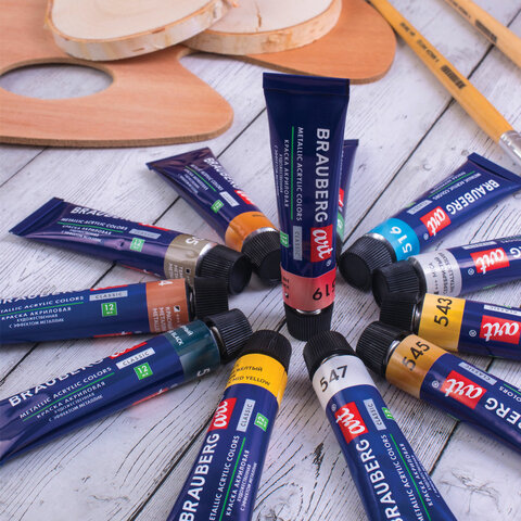 Краски акриловые художественные металлик BRAUBERG ART CLASSIC, НАБОР 12 шт, в тубах 12 мл, 191719