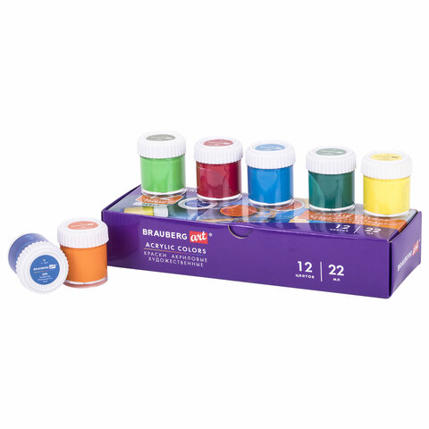 Краски акриловые художественные, НАБОР 12 штук по 22 мл в банках, BRAUBERG ART DEBUT, 192298