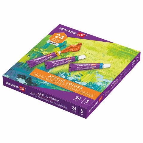 Краски акриловые художественные НАБОР 24 цвета по 5 мл, в тубах, BRAUBERG ART DEBUT, 192386
