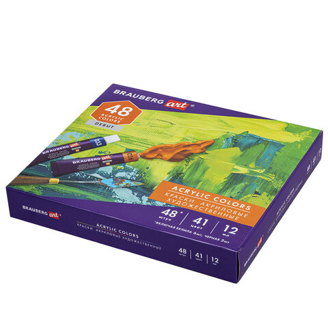 Краски акриловые художественные, НАБОР 48 штук, 41 цвет по 12 мл, в тубах, BRAUBERG ART DEBUT, 192295