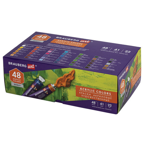 Краски акриловые художественные, НАБОР 48 штук, 41 цвет по 22 мл, в тубах, BRAUBERG ART DEBUT, 192302