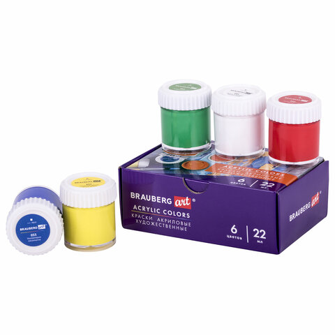 Краски акриловые художественные, НАБОР 6 штук по 22 мл в банках, BRAUBERG ART DEBUT, 192297