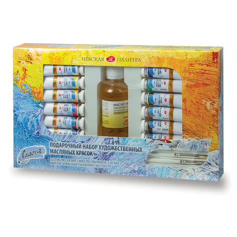 Краски масляные художественные "Ладога", 12 цветов по 18 мл + масло льняное 120 мл + 2 кисти, Невская Палитра, 1241967