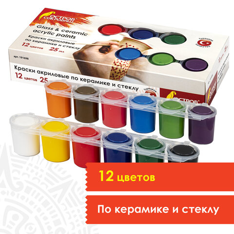 Краски акриловые по керамике и стеклу ОСТРОВ СОКРОВИЩ 12 цветов по 25 мл, 191698