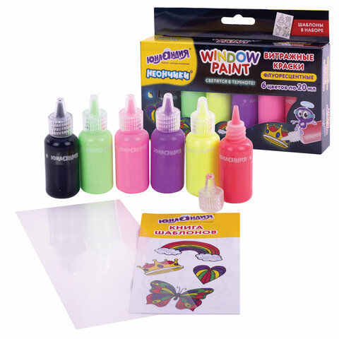 Краски витражные ЮНЛАНДИЯ "НЕОНЧИКИ", 5 цветов светящихся в темноте + 1 черный, 20 мл, шаблоны, 191760